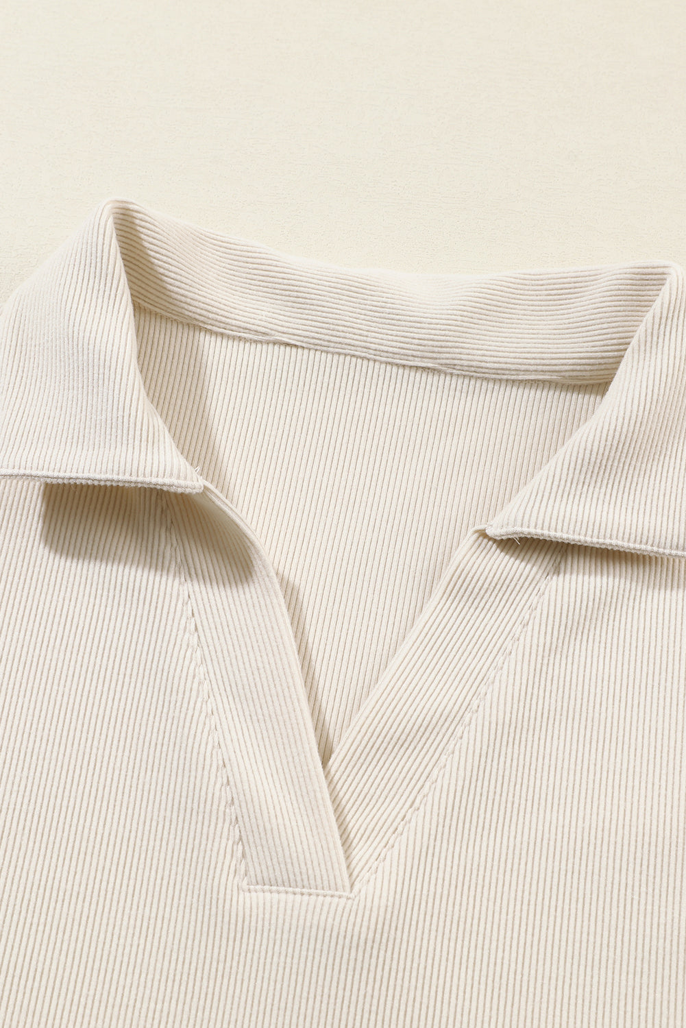 2pcs Beige Collared Split Neck Ribbed Athleisure Outfit