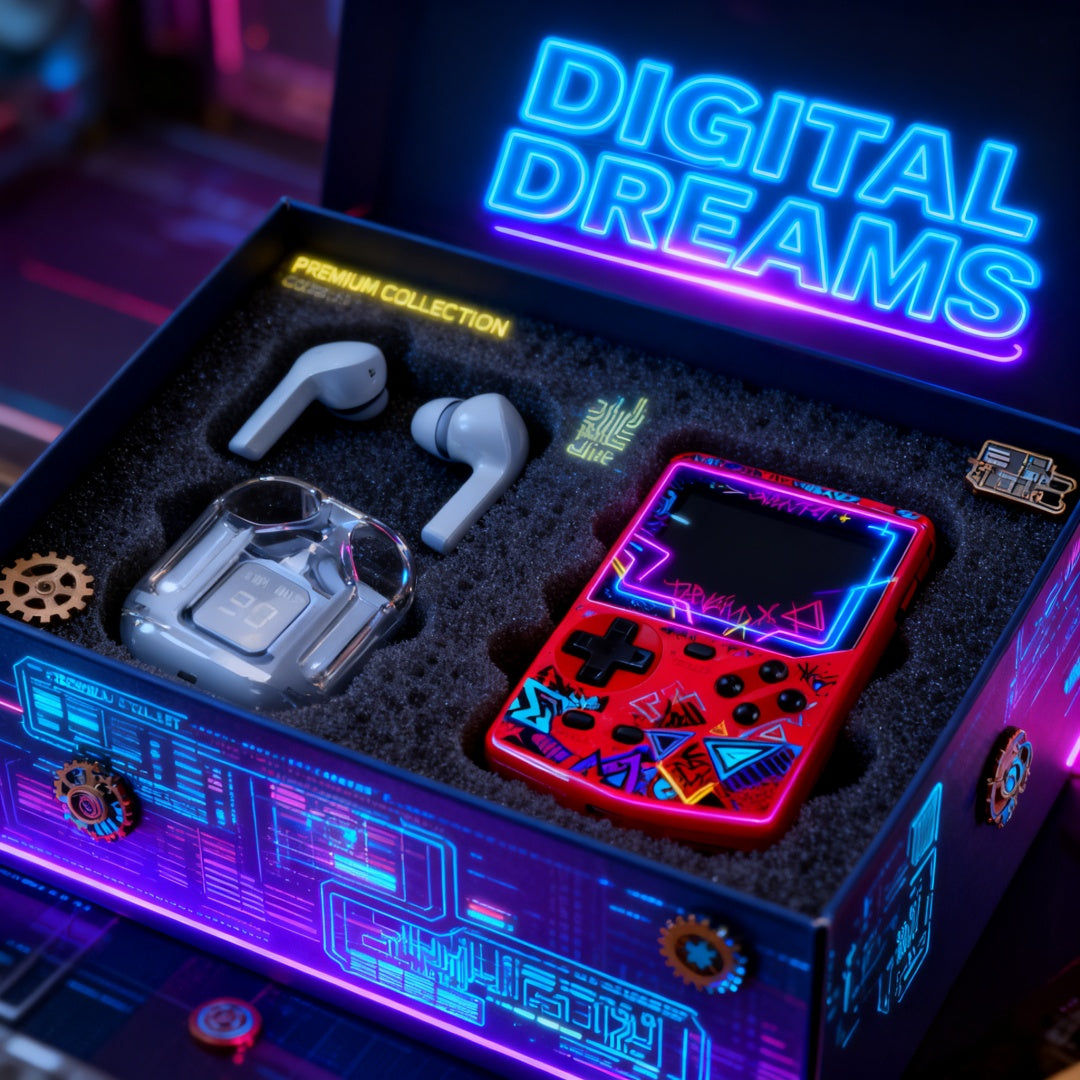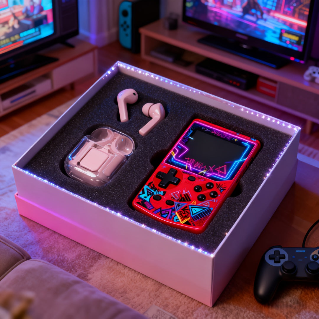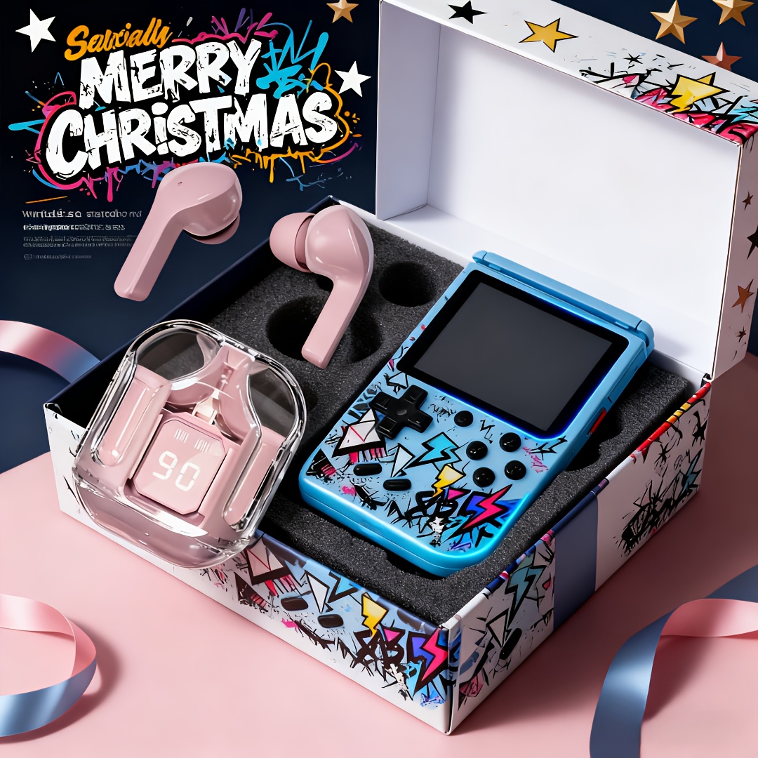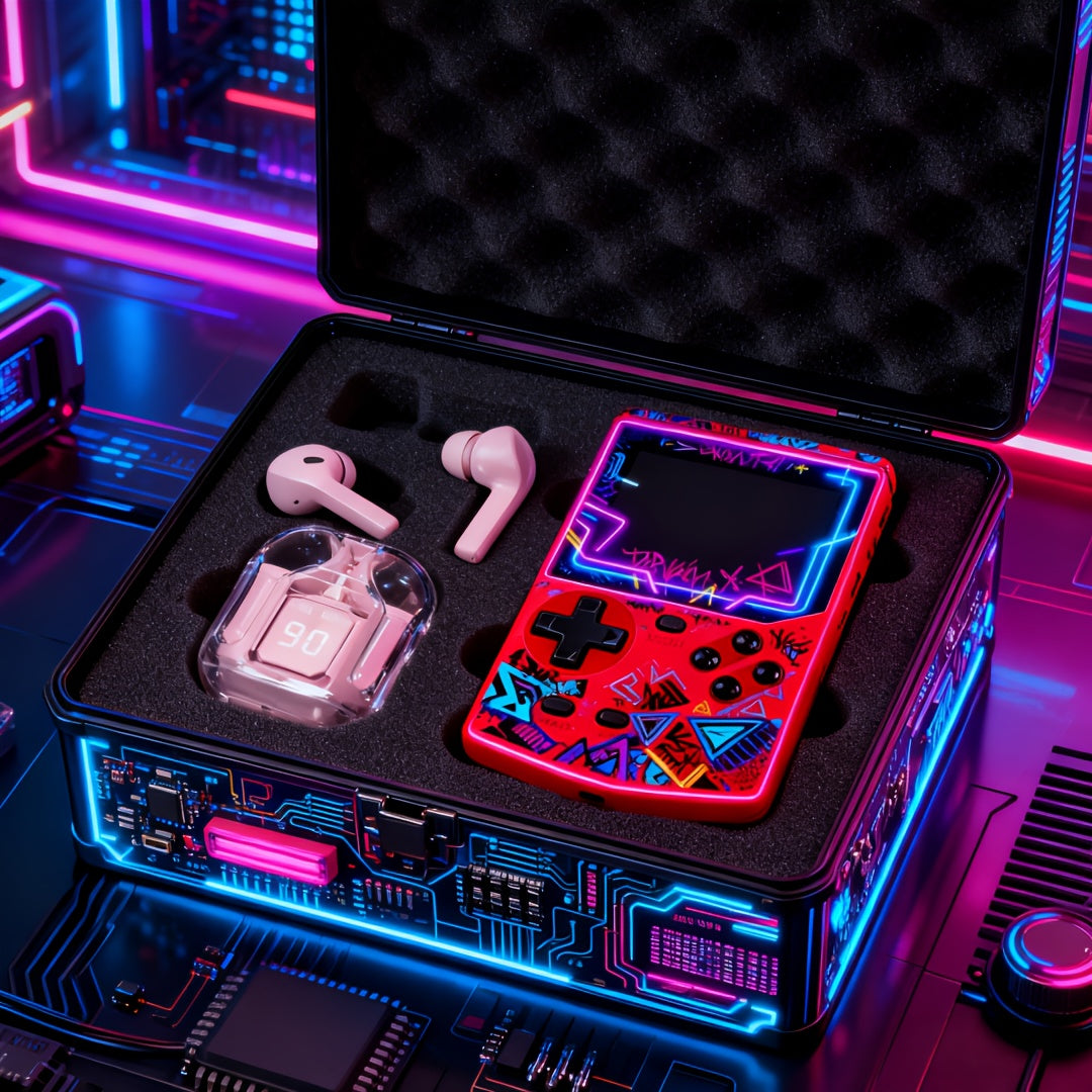 Level up your gaming with this dynamic duo! This retro handheld console pairs perfectly with stylish headphones for an immersive portable experience.
