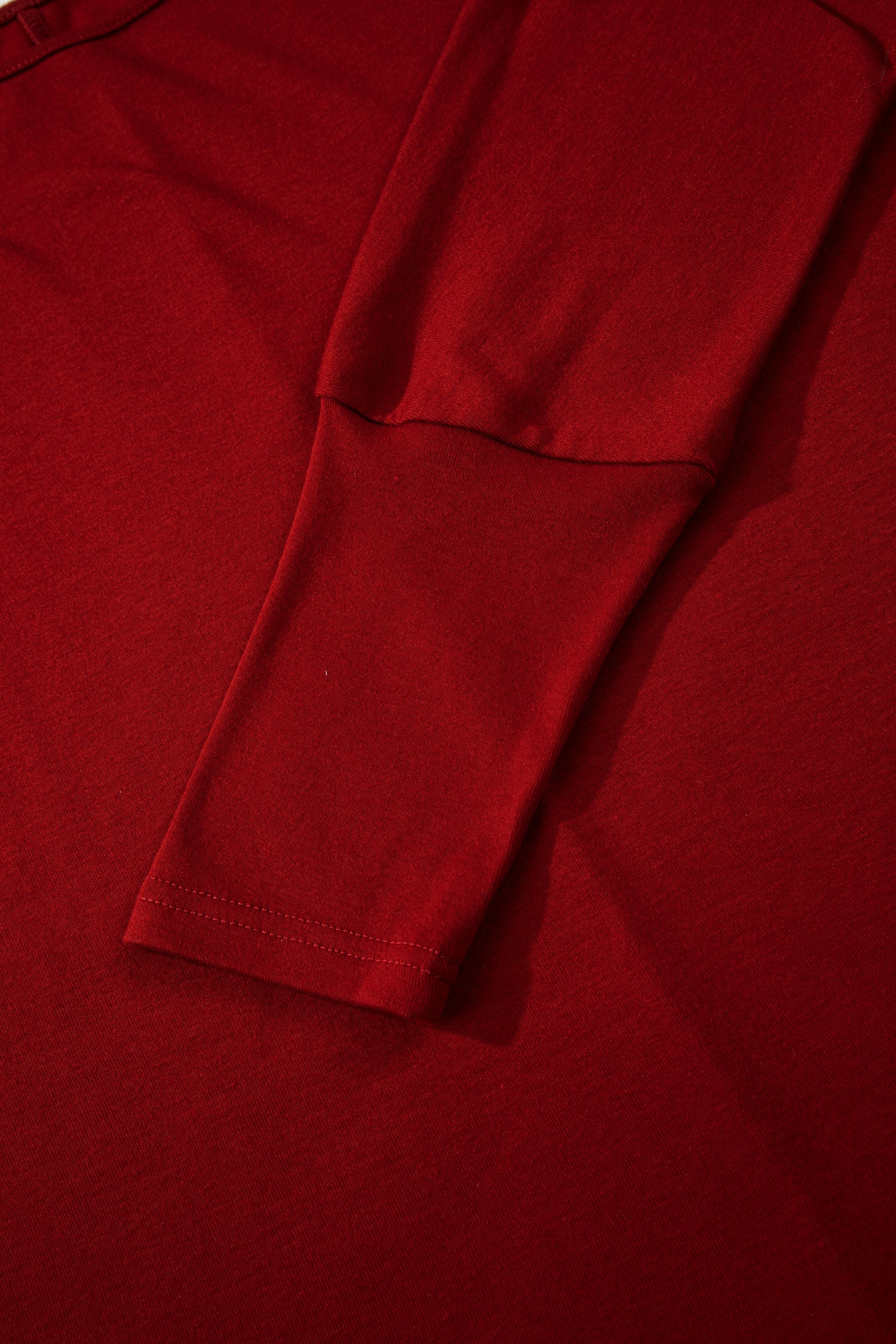 Make a statement in this vibrant crimson long-sleeve top, where extended cuffs add an unexpected twist to timeless style.